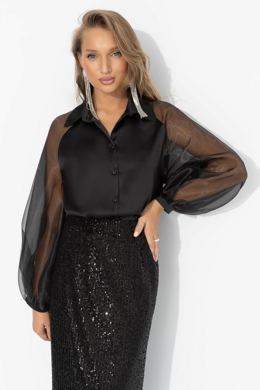Блуза чёрная из атласа с объёмными рукавами из органзы