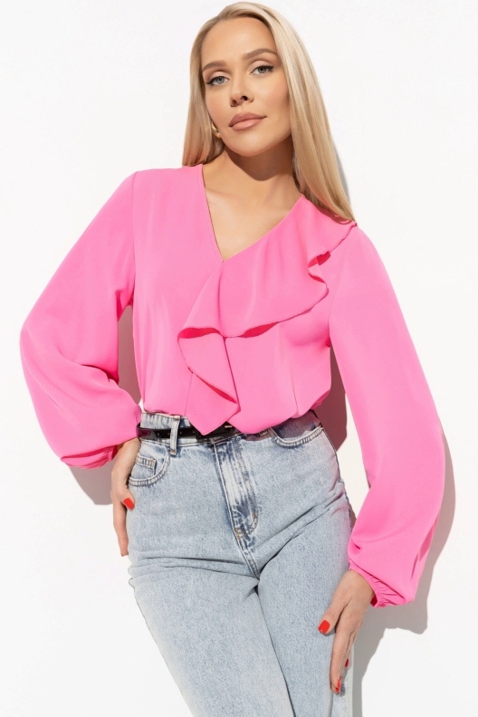 Блуза розовая с объёмным декором от компании Charutti. Модель свободного силуэта, выполнена из однотонной плательной ткани "ниагара". Горловина оформлена Vобразным вырезом. Рукава длинные втачные на резинке. Низ прямой. Хорошо смотрится навыпуск и в заправленном виде. Отличный выбор для офисных модниц.
