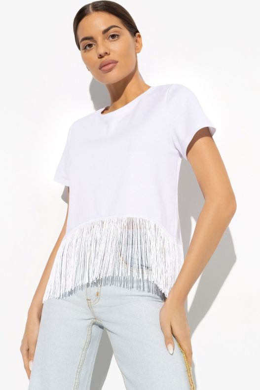 Футболка чёрная с бахромой по низу от компании Charutti. Модель прямого силуэта, выполнена из трикотажного полотна "милано". Круглый вырез горловины. Втачные короткие рукава. Идеальный выбор для Вашего стильного гардероба.
