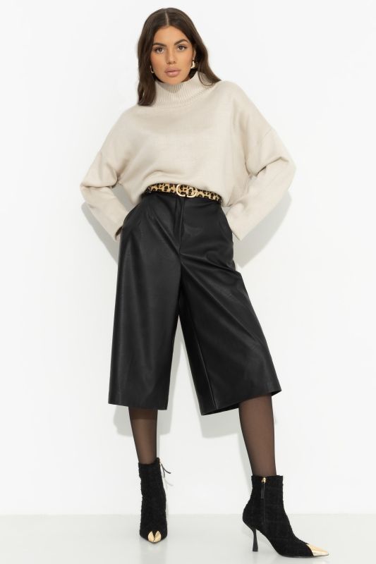 Кюлоты чёрные из экокожи от компании Charutti. Широкие, посадка высокая, на талии. Есть карманы. Изделие застегивается на пуговицу и молнию. Есть шлевки для ремня. Идеальный выбор для городских модниц. Ремень из экокожи в комплект не входит, продается отдельно.