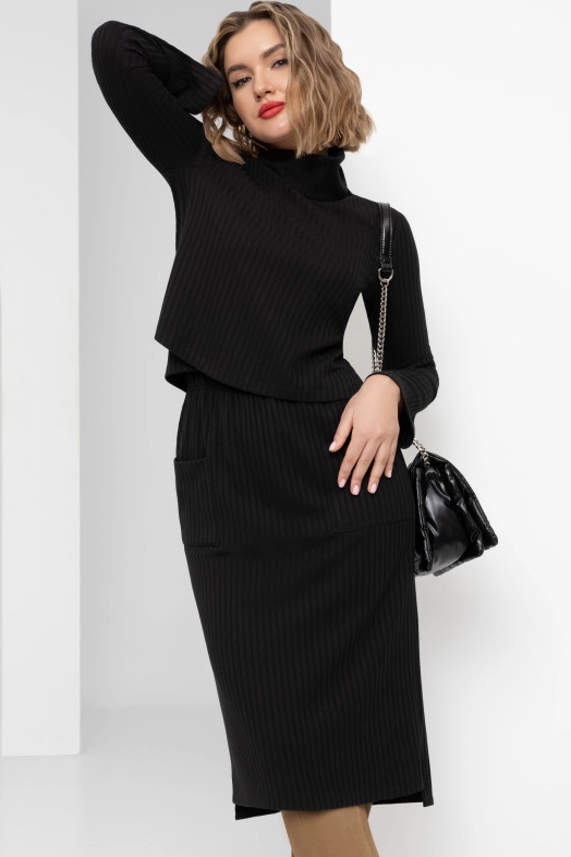 Однотонный юбочный костюм от компании Charutti, выполнен из трикотажного полотна "лапша" в чёрном цвете, состоит из джемпера и юбки. Джемпер свободного силуэта, воротник-стойка, втачные длинные рукава, низ асимметричный, с разрезами по бокам. Юбка свободного силуэта, с резинкой на поясе и накладными карманами по переду, низ асимметричный, с разрезами по бокам. Эффектный образ для рабочих будней.
