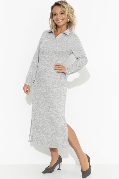 Платье серое с карманами от компании Charutti. Модель полуприлегающего силуэта, выполнена из трикотажного полотна. Воротник-стойка, длинные рукава. Низ ровный, по бокам резрезы. Отличный вариант для насыщенного событиями дня деловой леди.