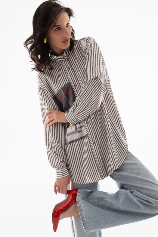Рубашка свободного силуэта в полоску от компании Charutti. Модель прямого силуэта, выполнена из плательной ткани «бабл-сатин» и шёлка «армани» . Воротник-стойка. Втачные длинные рукава на манжетах, со спущенной линией плеча. Центральная застёжка на пуговицы. Низ фигурный. Идеальный выбор для Вашего стильного гардероба.