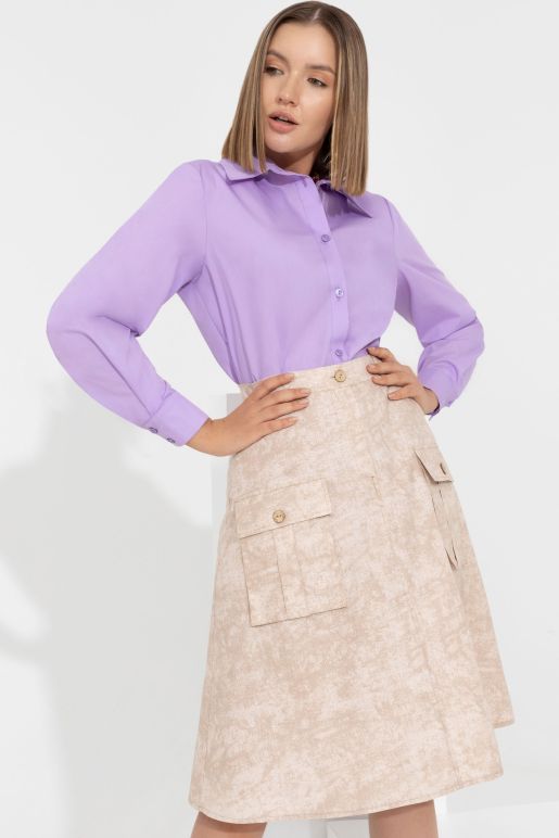 Стильная женская юбка от компании Charutti. Модель расширенного к низу силуэта, выполнена из полотна "ранфорс" бежевого оттенка. Притачной пояс со шлёвками и застёжкой на петлю-пуговицу и молнию. По переду накладные карманы с клапаном. Идеальный выбор для создания повседневного образа.