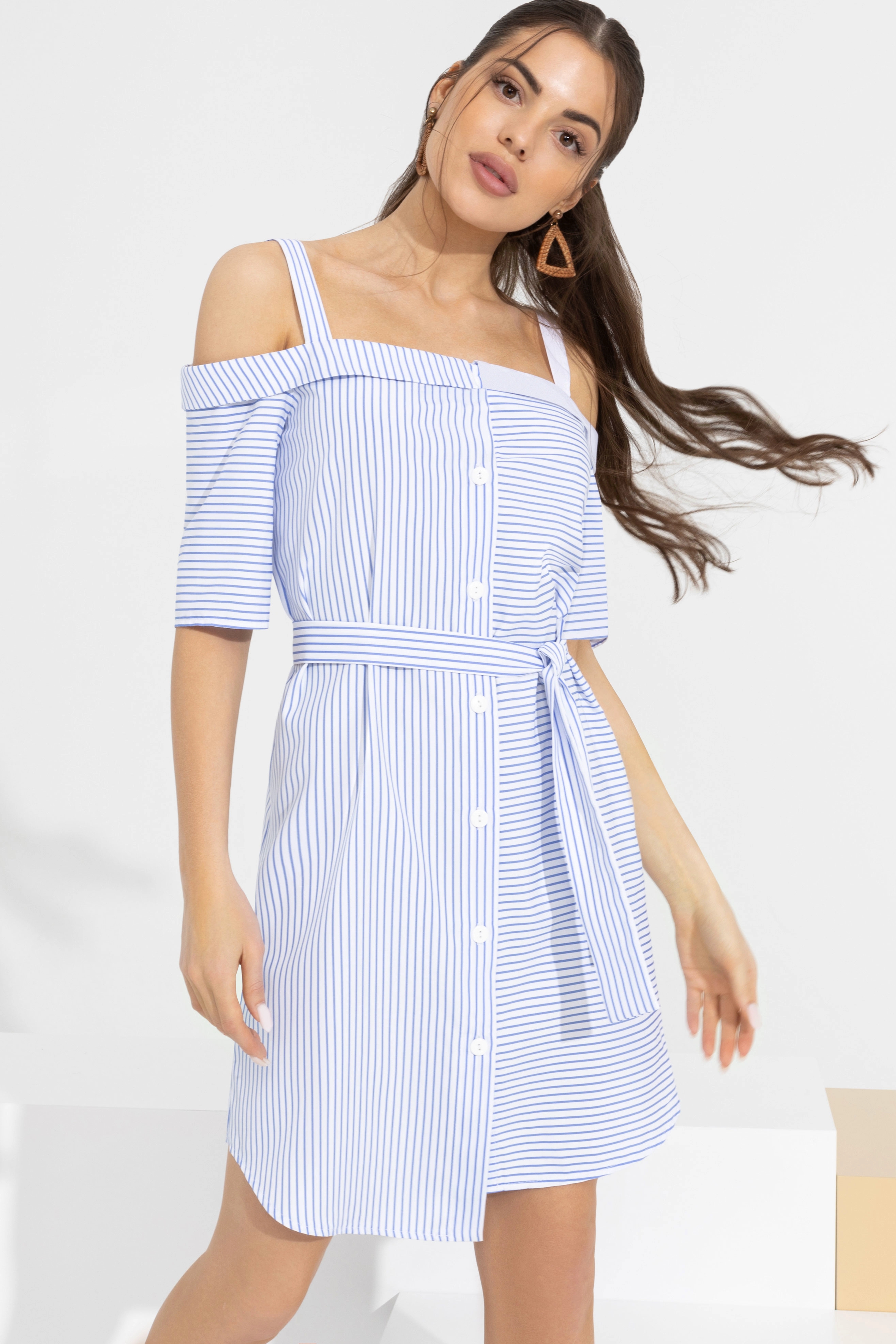 Стильный женский сарафан от компании Charutti. Модель прямого силуэта, выполнена из плательной полоски и поплина в голубом цвете. Вырез горловины с отворотом. Спущенные короткие рукава, с открытыми плечами, на тонких бретелях. Центральная застёжка на петли и пуговицы. Пояс из основной ткани входит в комплект. Низ асимметричный, фигурный. Это Ваш отличный образ, в котором вы всегда чувствуете себя уверенно.