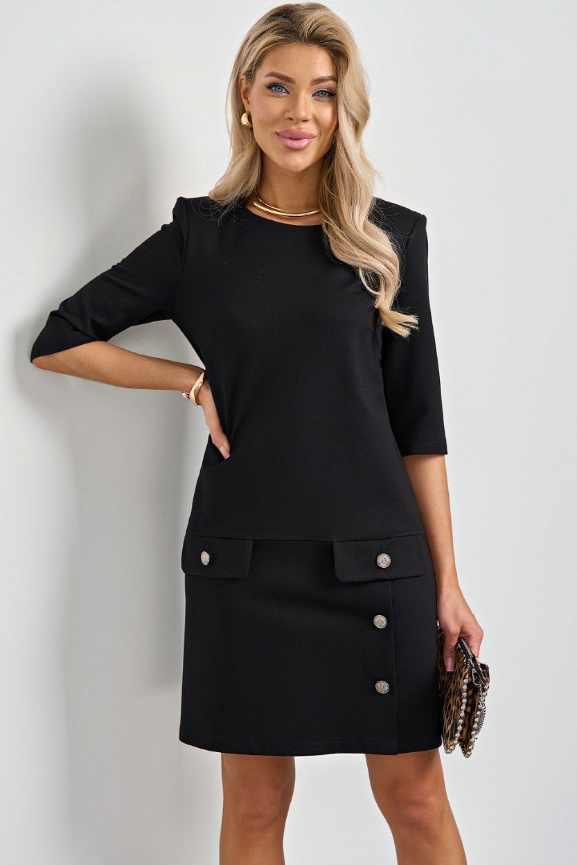 Платье чёрное трикотажное от производителя Jetty. Модель прямого силуэта, горловина оформлена круглым вырезом. Втачные укороченные рукава. По нижней части платья клапаны с декоративными пуговицами и разрез. Идеальный выбор на каждый день.