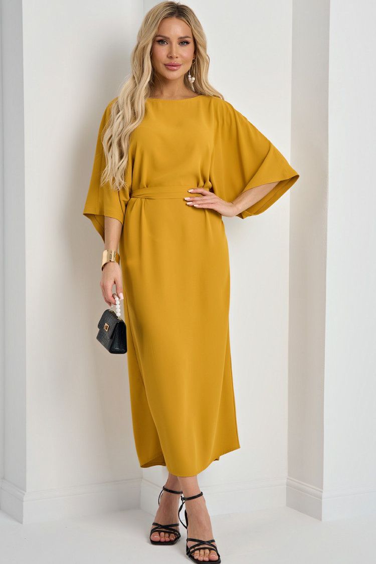 Платье длинное горчичного цвета с поясом от компании Jetty, выполнено из плательного полотна. Модель свободного кроя, круглый вырез горловины. Короткий цельнокроеный рукав. Спинка изделия со средним швом и шлицей сзади. Идеальный выбор для создания женственного образа.