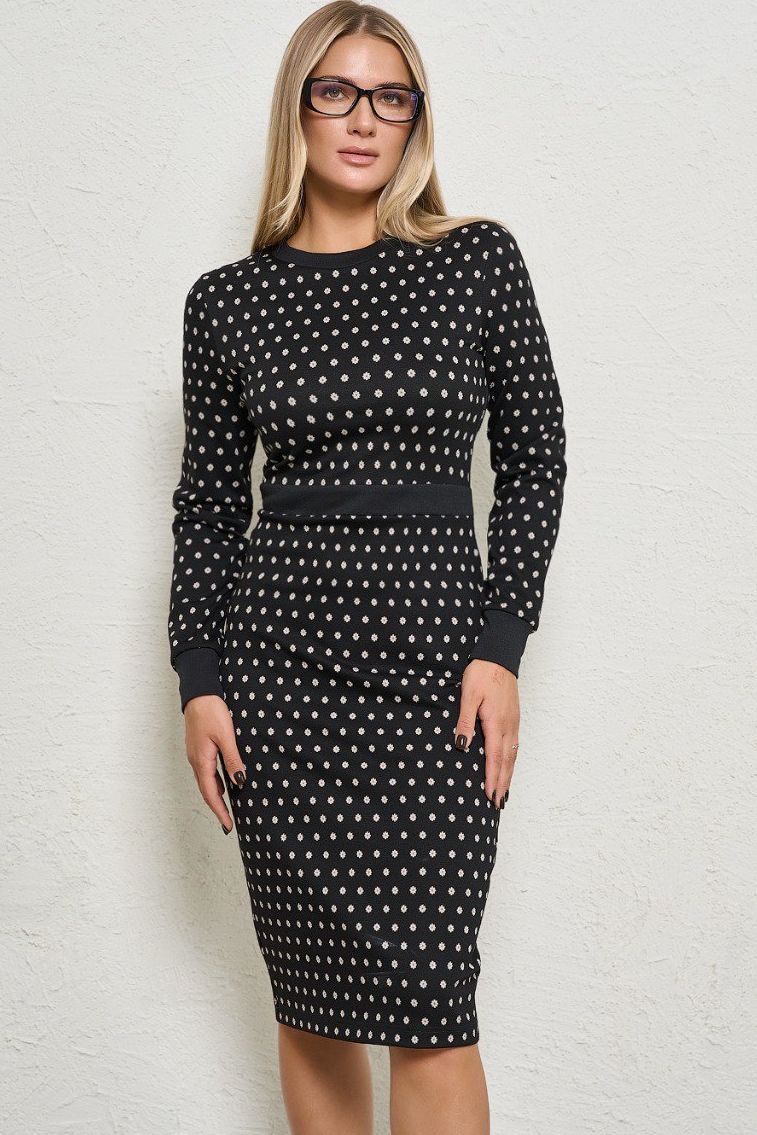 Платье-футляр чёрное трикотажное с принтом от компании Jetty. Круглый вырез горловины. Втачные длинные рукава на манжетах. Отрезное по линии талии. Без застёжки и подклада. Идеальный выбор для создания женственного образа.