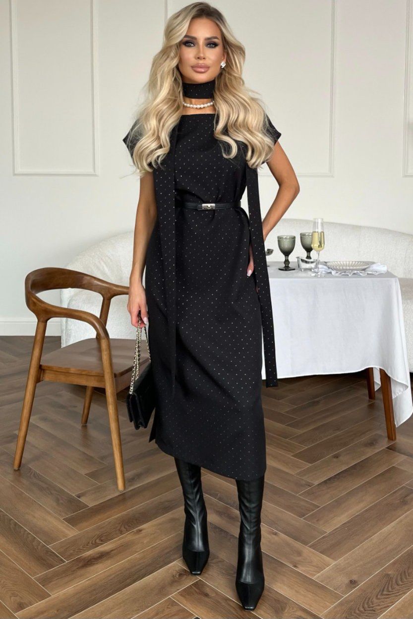 Платье-футляр трикотажное чёрное с рукавами из шифона