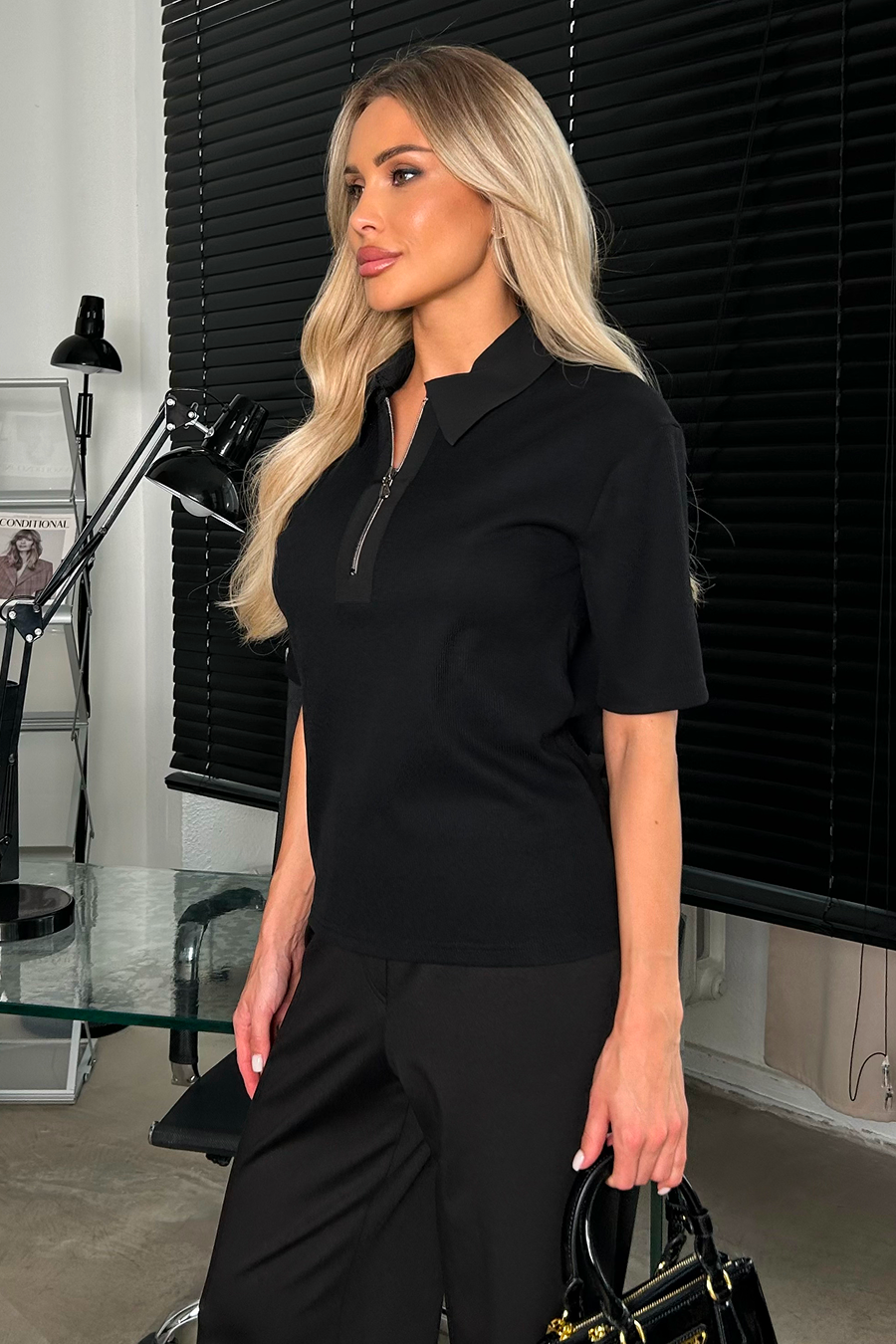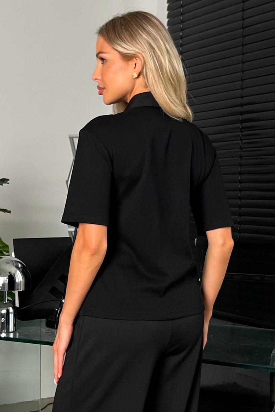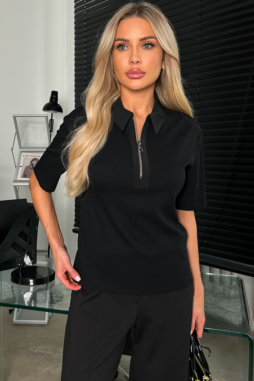 Джемпер трикотажный чёрный от компании Valentina. Короткий втачной рукав. Отложной воротник и планка выполнены из отделочной ткани Ниагара. По планке застежка-молния. Низ ровный без разрезов. Отличное решение на каждый день. Рекомендуемая стирка при t не более 30°.