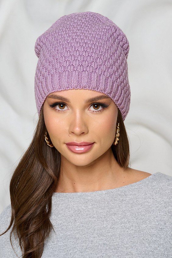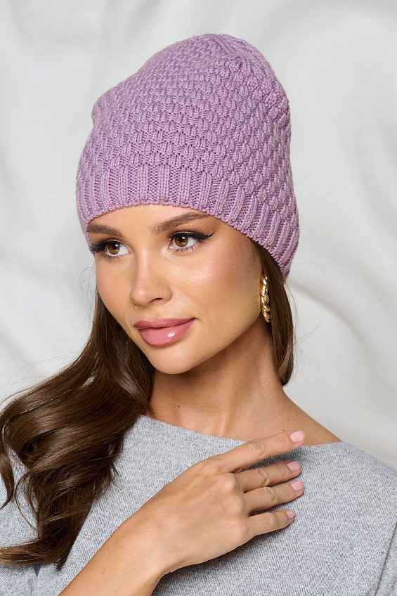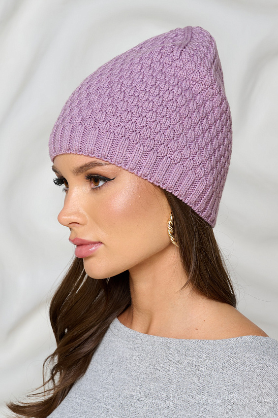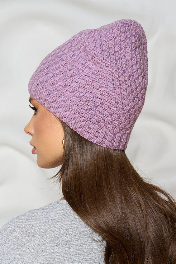Шапка тёплая сиреневого цвета от производителя Bellovera геометрической вязки на флисовой подкладке. Изделие отлично стилизуется под любой образ.