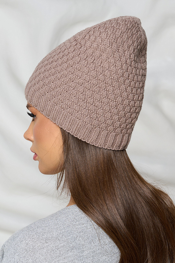 Шапка тёплая в цвете латте от производителя Bellovera геометрической вязки на флисовой подкладке. Изделие отлично стилизуется под любой образ.