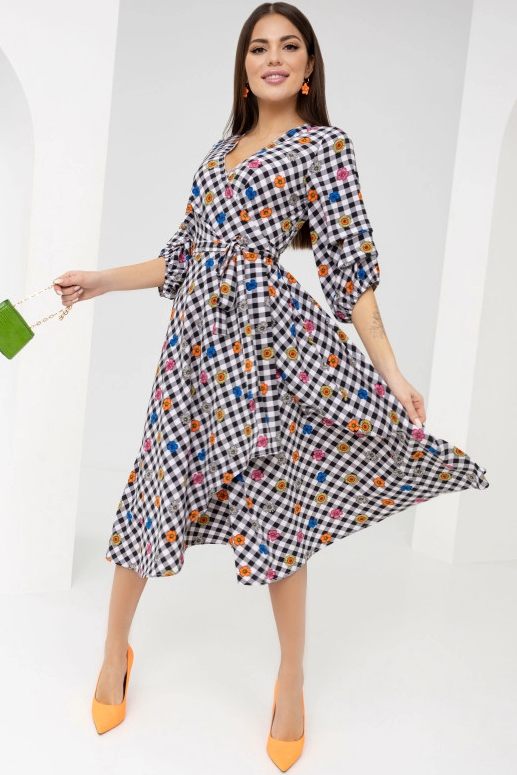 Симпатичное женское платье от компании Charutti. Модель свободного силуэта, на запах, выполнена из плательной ткани "ниагара" в чёрном цвете. V-образный вырез горловины. Втачной рукав 3/4, собран на резину. В комплекте пояс из основной ткани. По бокам удобные прорезные карманы. Это Ваш отличный образ, в котором вы всегда чувствуете себя уверенно.