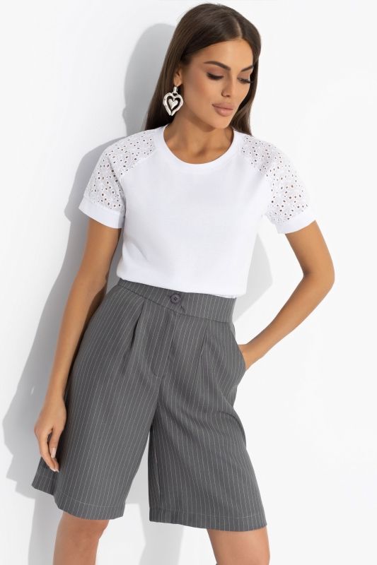 Шорты‑бермуды серые в полоску от компании Charutti. Модель свободного силуэта, выполнена из костюмной ткани. Притачной пояс с защипами, застёжкой на молнию и пуговицу. По бокам карманы. Идеальный выбор для создания стильного образа.