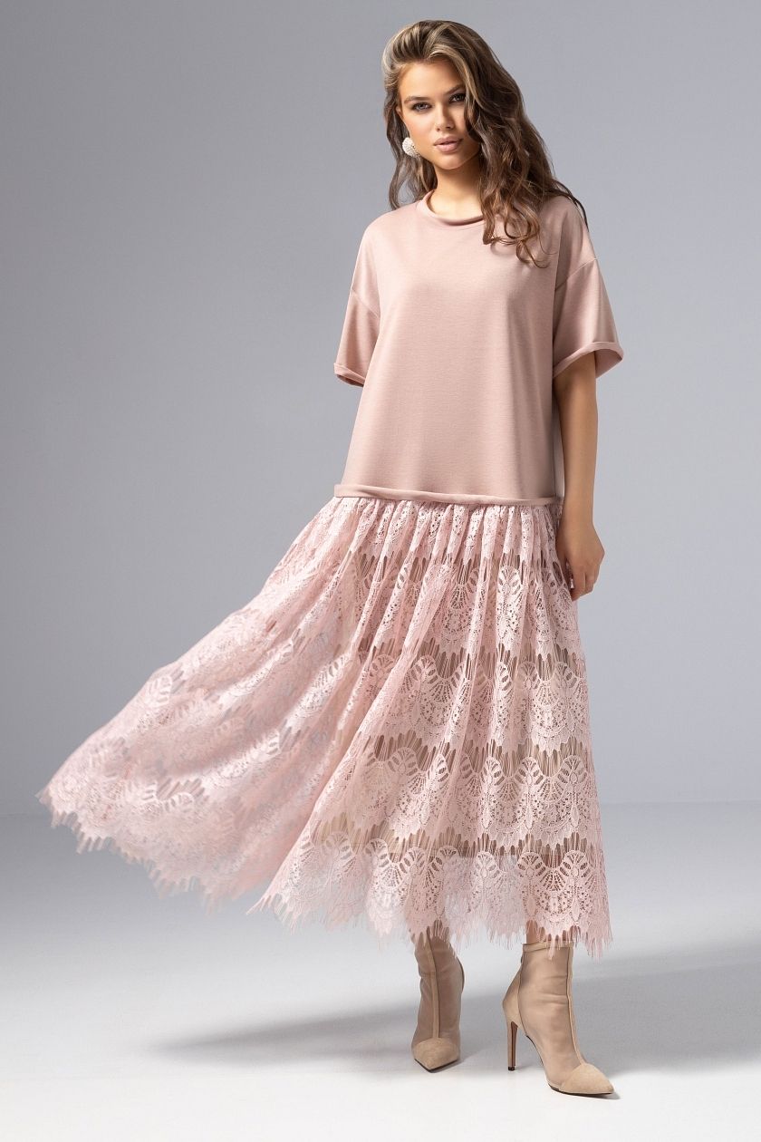 Платье комбинированное с кружевом розового цвета