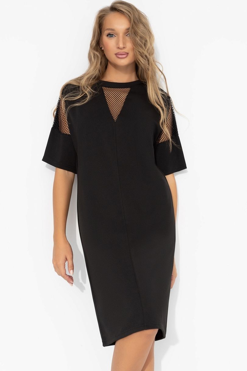 Платье миди чёрное прямое от компании Charutti, выполнено из трикотажного полотна "диор". Круглый вырез горловины. Короткие рукава. Платье дополнено вставками из сетки. Без застёжки. Это Ваш отличный образ, в котором вы всегда чувствуете себя уверенно.