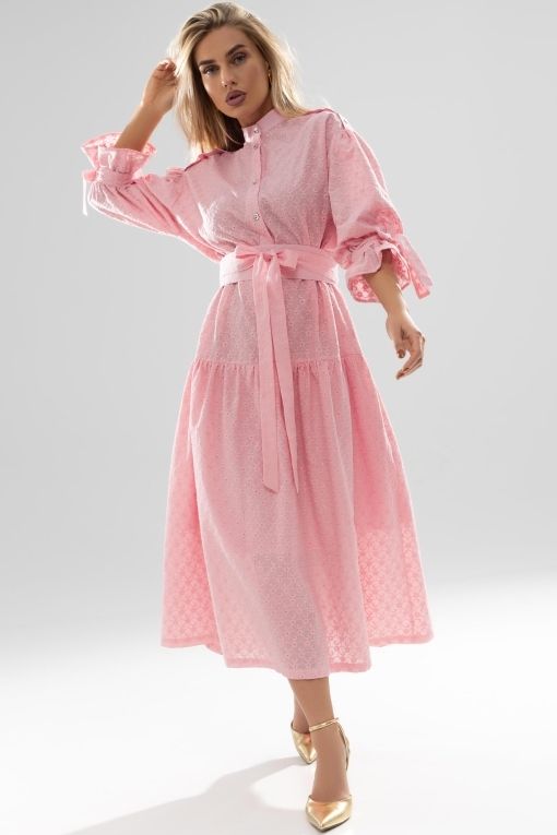 Платье розовое из шитья с поясом от бренда Charutti. Модель свободного силуэта, на подкладе из ткани "ниагара". Воротник-стойка, рукава укороченные с завязками. По переду застёжка на пуговицы. Отрезное ниже линии талии. В этом платье вы будете королевой вечера!