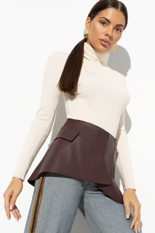 Баска коричневая из экокожи с перфорацией от компании Charutti. Слегка асимметричный крой, текстильный подклад. Имитация карманов. Застегивается на клепки. У баски есть боковые швы, ровнять изделия нужно по ним. Это отличное дополнение для Вашего стильного образа.