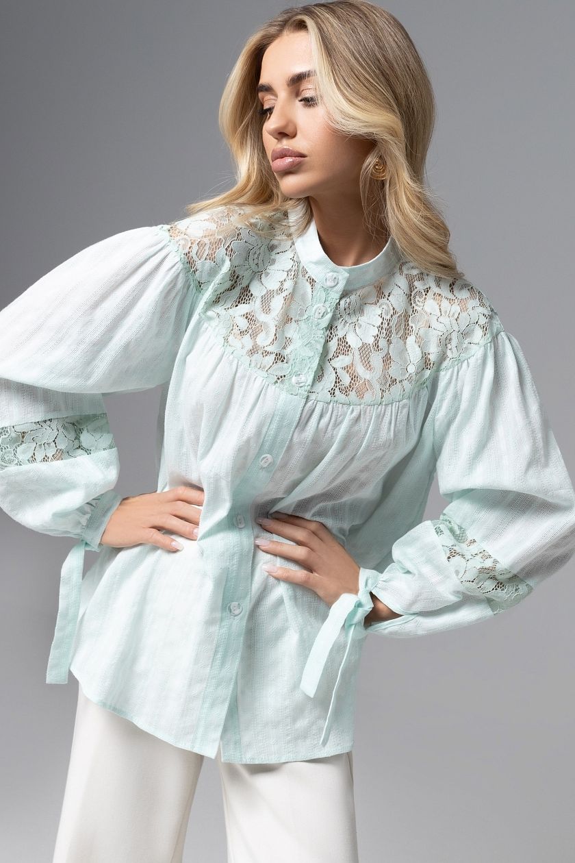 Рубашка мятная с объёмными рукавами от компании Charutti. Модель свободного силуэта, выполнена из хлопка. Акцентные детали из кружева. Воротник-стойка, завязки на рукавах изделия. Рубашка хорошо смотрится в заправленном виде и навыпуск. Прекрасное решение для создания стильного образа.