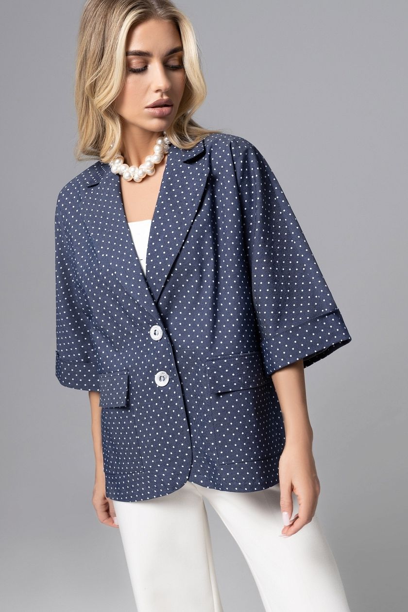 Жакет из джинсы в горошек от компании Charutti. Модель свободного кроя с лацканами, однобортный. Изделие с подплечниками и карманами, без подклада. Деликатные разрезы по бокам изделия. Хлопок хорошо держит форму. Можно стилизовать с юбками, брюками и джинсами.