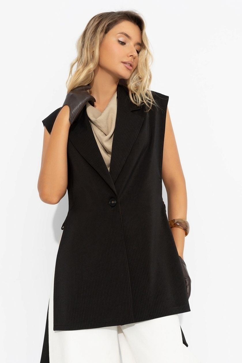 Трикотажный сарафан с лямками из экокожи 46 размера