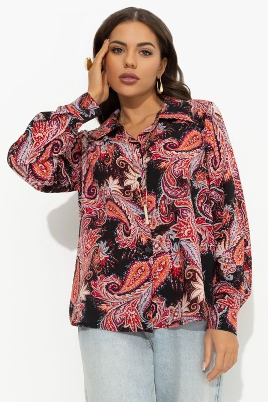 Рубашка шифоновая с принтом от компании Charutti. Модель свободного силуэта. Горловина оформлена отложным воротником на стойке. Втачные длинные рукава с манжетами. Центральная застёжка на петли и пуговицы. Отличный выбор как для отдыха, так и для деловой встречи.