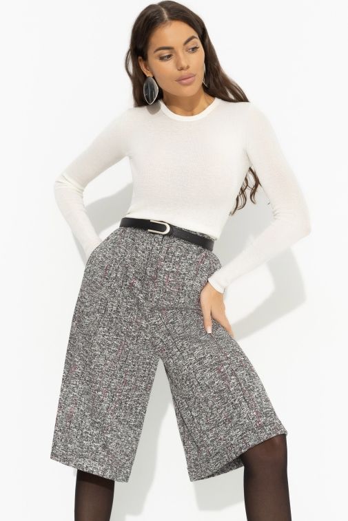 Кюлоты серые из трикотажа с карманами от компании Charutti. Отвороты на подоле штанин прошиты. Посадка изделия на талии. Застежка на пуговицу и молнию. Идеальный выбор для городских модниц. Ремень из экокожи в комплект не входит, продается отдельно.