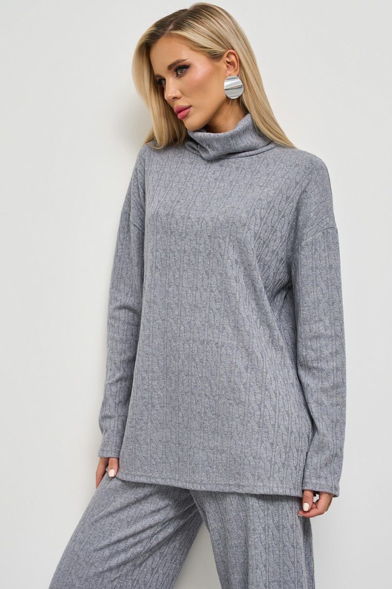 Джемпер серый свободный с разрезами по бокам от компании Jetty. Горловина оформлена воротником-стойка. Спущенная линия плеча. Длинный широкий рукав. Идеальный выбор на каждый день.