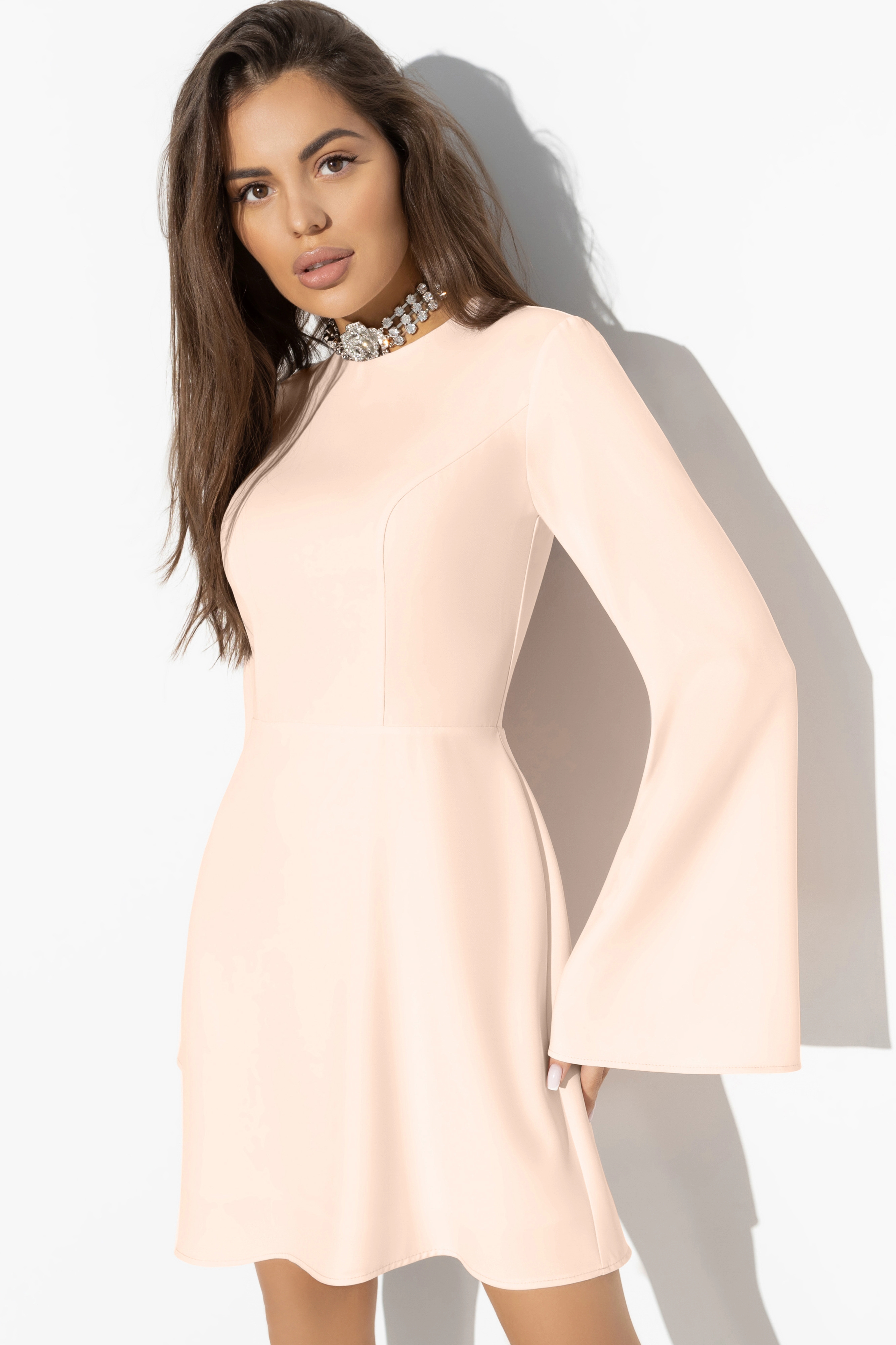Розовое платье с расклёшенными рукавами от компании Charutti. Модель полуприлегающего силуэта, выполнена из костюмной ткани «гальяно». Круглый вырез горловины с застёжкой на пуговицу по спинке. Втачные длинные рукава. Изделие отрезное по линии талии. Спинка открытая, низ ровный. Идеальный выбор для создания женственного образа.