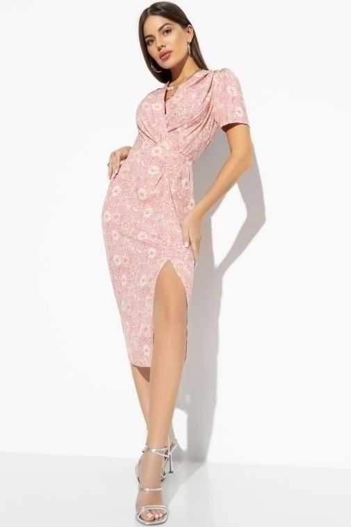 Платье розовое на запах с разрезом по переду от компании Charutti. Модель прилегающего фасона, выполнена из штапельного полотна с принтом. V-образный вырез горловины. Короткий втачной рукав. Эффектный образ на каждый день. Ремень в комплект не входит.