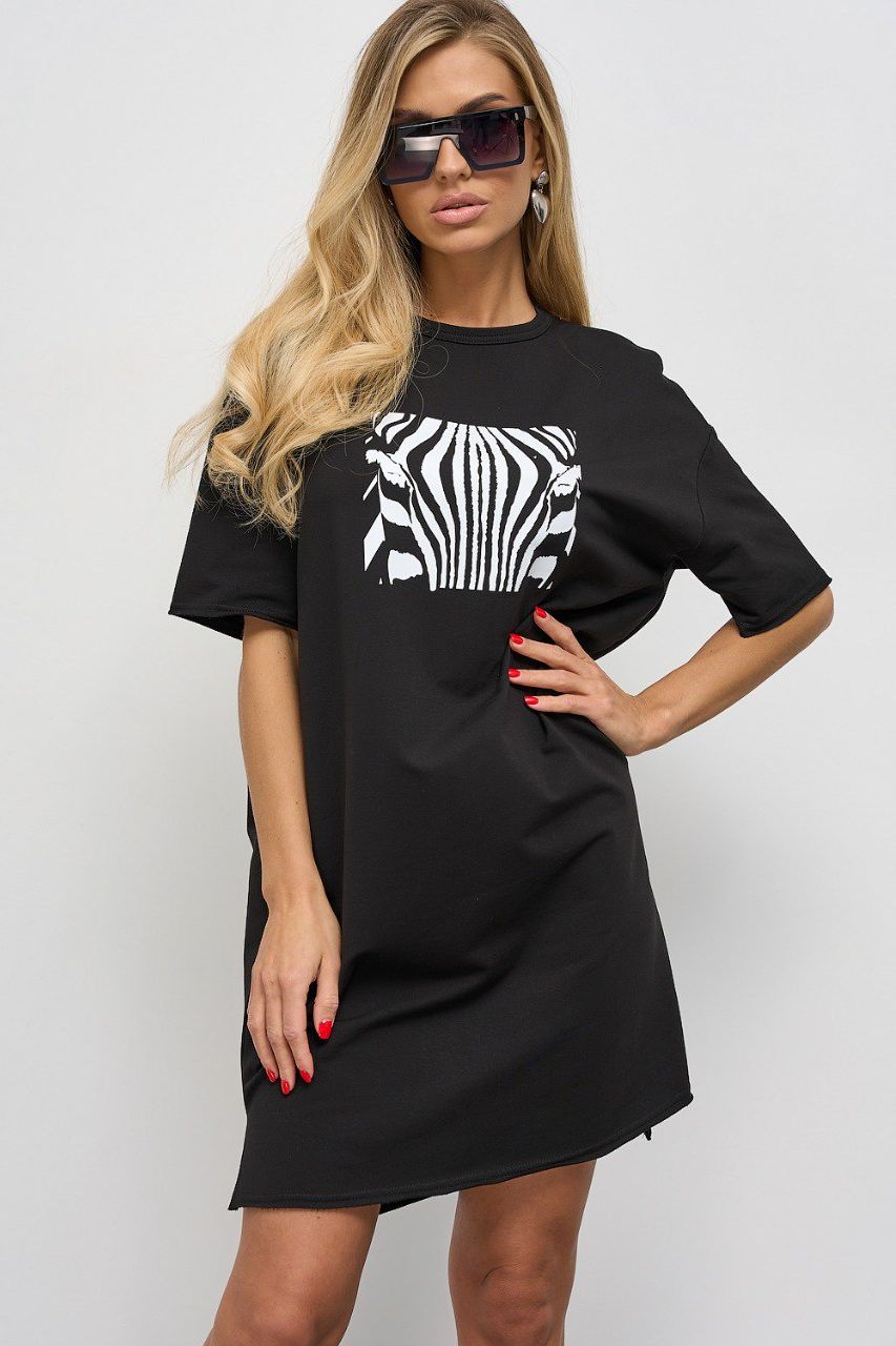 Платье-футболка чёрное с принтом от компании Jetty. Модель свободного силуэта, выполнена из тонкого футера 2-х нитка. Круглый вырез горловины декорирован принтованым трикотажным манжетом. Короткий широкий рукав, спущенная линия плеча. Низ изделия и рукава с открытым срезом (не обработанный). Низ спинки слегка удлинен относительно переда. В боковых швах разрезы. Прекрасный вариант для повседневной носки.