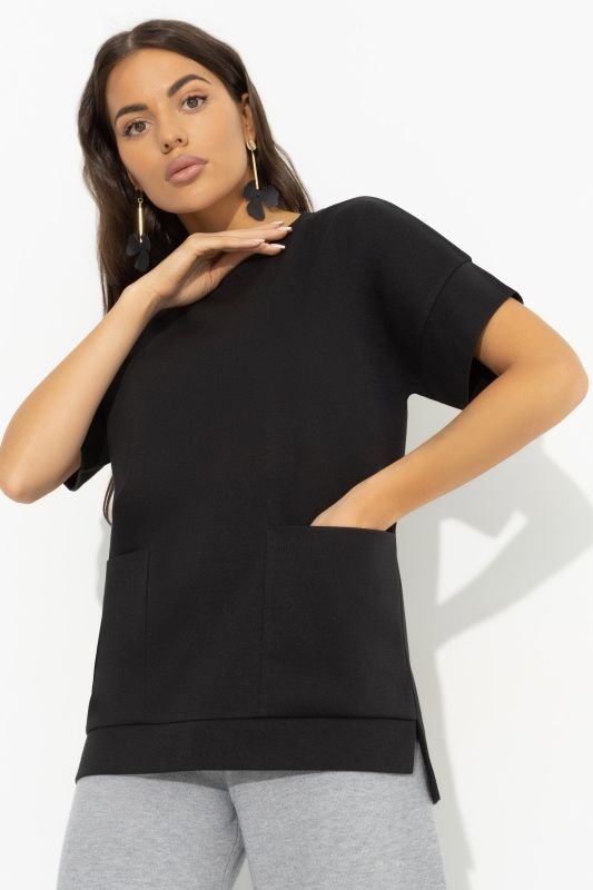 Туника чёрная трикотажная с карманами от компании Charutti. Модель удлиненная, прямого силуэта. Круглый вырез горловины. Отвороты на коротких рукавах прошиты. Деликатный разрез по боковым сторонам изделия. Идеальный выбор для Вашего повседневного гардероба.