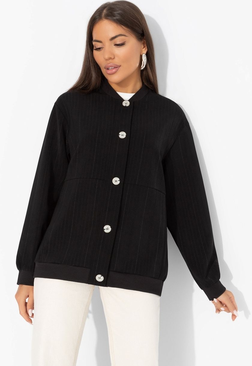 Бомбер чёрный в полоску от производителя Charutti. Модель свободного кроя, выполнена из костюмного полотна. Ворот и подол изделия оформлены трикотажной резинкой контрастного цвета. Изделия застегивается на пуговицы. Рукава оформлен скрытыми широкими резинками. Изделие с карманами. Без подклада. Идеальный выбор для создания стильного образа.